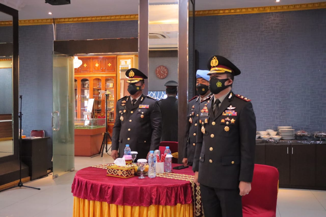 LAMPUNG - Kepala Biro Operasi (Karo ops) Polda Lampung Kombes Pol Wahyu Bintono Haribawono bersama Pejabat Utama (PJU) Polda Lampung mengikuti upacara peringatan Hari Kesaktian Pancasila secara virtual di Siger Lounge Polda Lampung, Jumat (1/10) pagi.